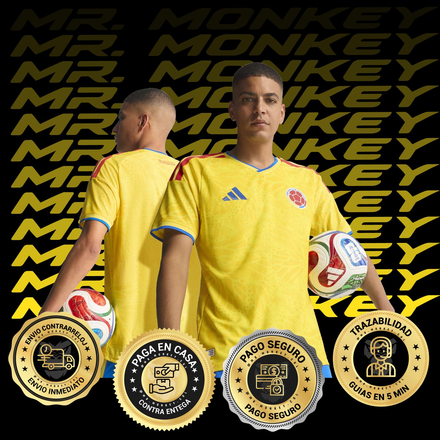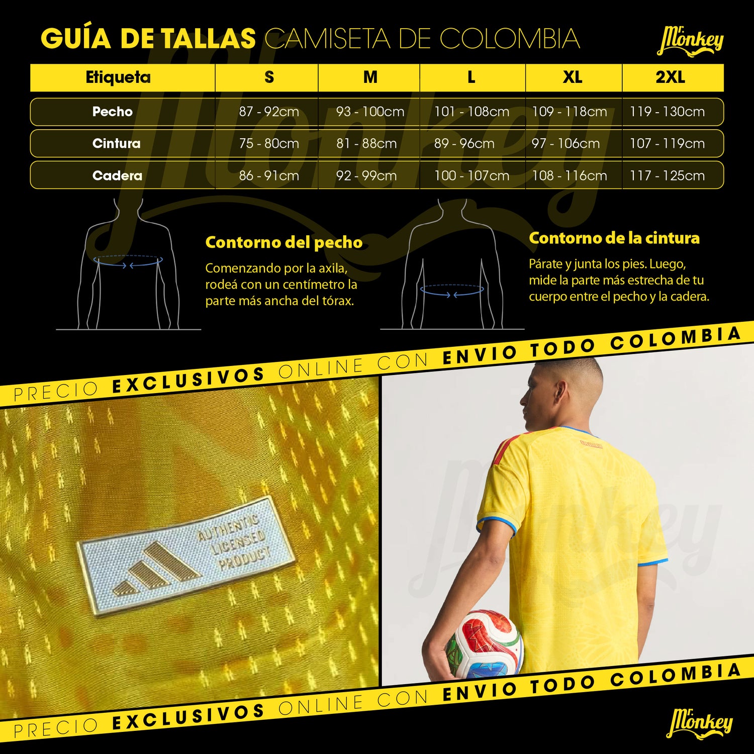 Características: La camiseta de Colombia modelada es talla L, quien la porta mide 175 contextura atlética, la prenda es en poliéster, está diseñada para quedar ajustada, es la versión deportista con logos en silicona para mas comodidad y holográficos termosellados.